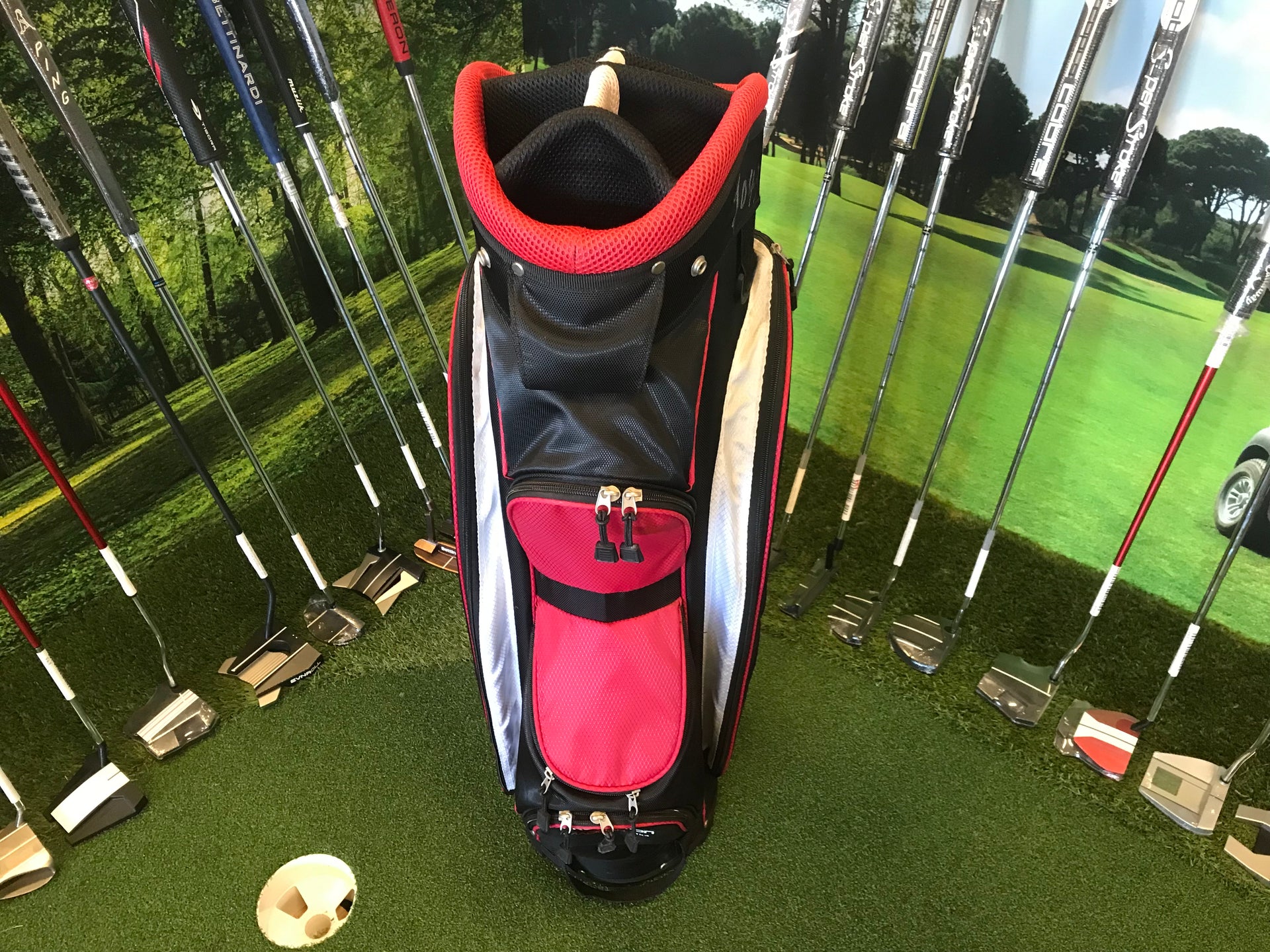 The Prosimmon 7-Way Cart Bag is a practical golf bag designed for use on riding or push carts, featuring a 7-way top to keep clubs organized and easily accessible. It typically includes multiple pockets for apparel, valuables, and accessories, as well as a cooler pocket and soft storage for delicate items. Built with durable materials and a cart-friendly base, the bag offers convenience and protection on the course, making it a solid choice for golfers seeking organization without the bulk of larger divider systems.