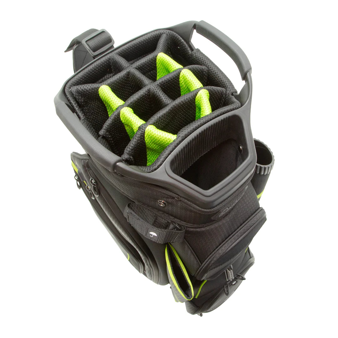 The Optima Glory features 14-way full length dividers with an external putter pit and umbrella sheath, new easy-lift top and base handles, and an ultra stable base, premium padded hood and full-sized stashaway rain coverall, waterproof fleece lined valuables pocket, tee and pen holders, and cooler pocket with drainage. The Glory bag now tips the scales at 3.2kg (24% lighter than before) so it is even easier to push around.